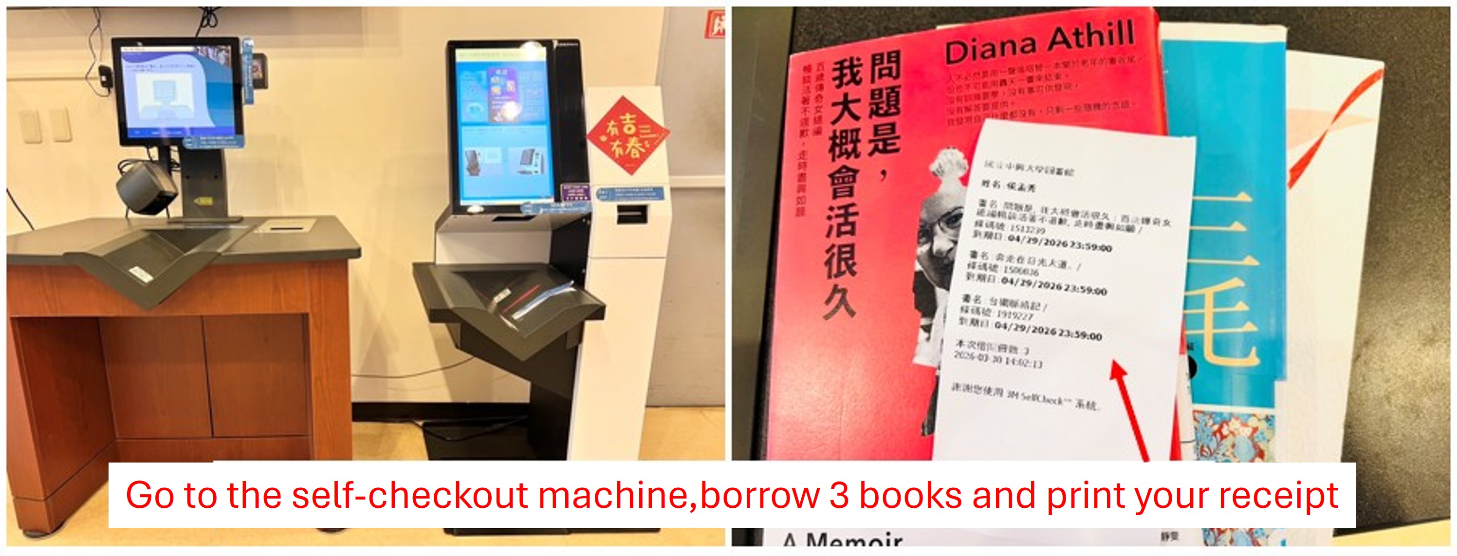 - Borrow 3 books at the 1F self-checkout machine→ Don't forget to print your receipt