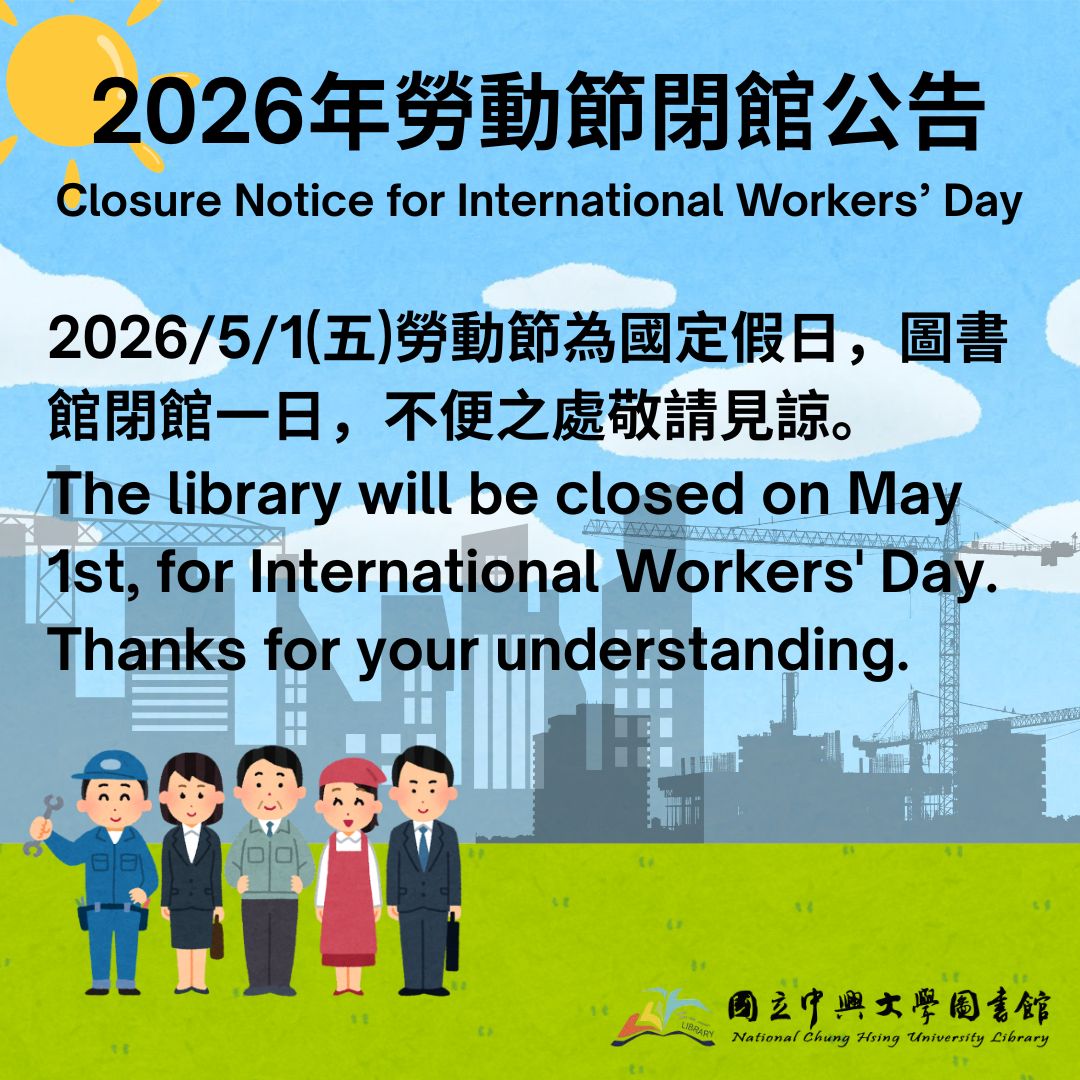 2026/5/1(五)勞動節為國定假日,圖書館閉館一日,不便之處敬請見諒。